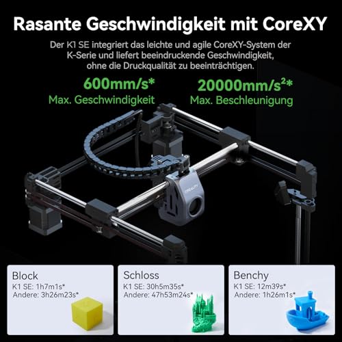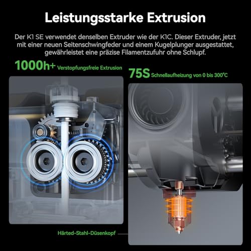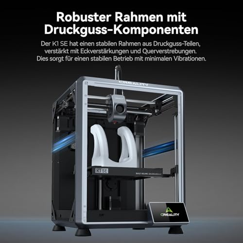 | Features | Benutzerfreundliche Bedienung– Der K1 SE ist vormontiert und automatisch kalibriert, sodass er bereits 3 Minuten nach dem Auspacken druckbereit ist. Keine lästige manuelle Nivellierung mehr – ideal für Kinder, Anfänger und Heimprojekte. Einfach anschließen und loslegen!, 600mm/s MAX Hochgeschwindigkeitsdruck– Der Creality K1 SE verfügt über eine Core XY-Struktur und erreicht Geschwindigkeiten von bis zu 600mm/s mit 20000mm/s² Beschleunigung, wodurch Drucke 12-mal schneller als bei herkömmlichen 3D-Druckern erstellt werden. Diese schnelle Leistung verkürzt die Druckzeiten erheblich, ohne die Druckqualität zu beeinträchtigen. Perfekt für alle, die schnelle und zuverlässige Ergebnisse benötigen, ohne Kompromisse bei der Druckstabilität einzugehen., Automatische Kalibrierung für Komfort– Mit nur einem Knopfdruck bietet der K1 SE eine automatische Z-Versatz-, Nivellierungs- und Input-Shaping-Tests. Bei einem teilweisen Druckfehler kann der fehlerhafte Abschnitt ausgeschlossen werden, sodass Sie den Druck fortsetzen können, ohne das gesamte Projekt neu zu starten – das spart Zeit und Material., Robuste Druckqualität– Der Dual-Gear-Extruder aus Vollmetall, ausgestattet mit einer Stützfeder und einem Kugelkolben, sorgt dafür, dass das Filament sicher an Ort und Stelle bleibt. Der K1 SE kann auch flexible Materialien wie TPU verarbeiten. In Kombination mit dynamisch ausbalancierten Lüftern und aktivem Input Shaping entstehen glatte Drucke ohne Oberflächenfehler oder Ringe., Open-Source Creality OS für Flexibilität– Mit Creality OS, basierend auf Klipper, bietet der K1 SE erweiterte Funktionen wie Linear Advance und Input Shaping. Es ist anpassbar und Open-Source, was Ihnen Zugang zu einer großen Community für Optimierung und Erweiterung gibt. Darüber hinaus bietet die Creality Cloud eine umfassende 3D-Druckplattform für Fernsteuerung und Projektaustausch., Robuster Rahmen für Stabilität– Der K1 SE verfügt über einen steifen Aluminiumlegierungsrahmen, der mit Eckverstärkungen und Querträgern verstärkt ist, um minimale Erschütterungen während des Betriebs zu gewährleisten. Vorgefertigte Dämpfungspads reduzieren die Vibrationen weiter und sorgen für stabile und präzise Drucke. |