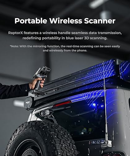 Erlebe den kabellosen Creality RaptorX 3D-Scanner mit 0,02 mm Genauigkeit und 34 Laserlinien. Scanne Objekte von 5 bis 4000 mm mühelos und genieße eine reibungslose Handhabung dank fortschrittlicher Tracking-Technologie.