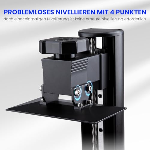 Die 4-Punkt-Nivellierung ist ein weiterer Pluspunkt, da sie die Einrichtung erheblich vereinfacht. Nach der ersten Nivellierung sind in der Regel keine weiteren Anpassungen notwendig, was Zeit spart und die Druckergebnisse konsistent hält.