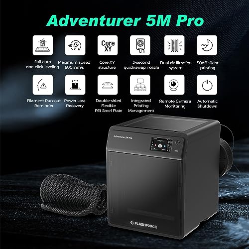 | Features | 🚀【Erfolg mit einer perfekten ersten Schicht】 Die vollautomatische Ein-Klick-Nivellierung kalibriert und nivelliert das Bett richtig, sodass Sie die perfekte erste Schicht für jeden 3D-Druck sind. Es bietet genaue und glatte Oberfläche, um hochwertige Druckleistung zu erzielen., 🌌【Ultraschnelle und außergewöhnliche Qualität】 Core XY bis 20000 mm/s² Beschleunigung, maximale Geschwindigkeit 600mm/s, die Beschleunigung von Null auf 600 mm/s dauert nur 0,025 Sekunden. Vom Auspacken bis zum Start des Drucks, nur 10mins, Genießen Sie glückliches Drucken jeden Tag und große Rundum-Qualität., ✨【Dual air filtration system & 50dB Silent Printing】 Adventurer 5M Pro verwendet ein duales Filtersystem der internen und externen Zirkulation. Zweischichtige Filtration–HEPA13 und Aktivkohle, effektiv blockieren 99% von Partikeln und VOCs und schützen so Ihre Atemwege. Geschlossener 3D-Drucker mit einem dualen Filtrationssystem, geeignet für den Einsatz in geschlossenen Umgebungen wie Arbeitszimmer und Klassenzimmer. 50dB geräuscharmer Druck, keine Störung der Arbeit oder des Studiums., ☄️【Vibrationskompensation&Weniger Wartezeit】 Schwingungskompensation, Beseitigung von Geistern in Abdrücken. Düse mit einem Fluss von 32mm³/s, 50w Heizleistung, 200℃ Aufheizen in 35 Sekunden. Präzise und konsistente Extrusion für glatte und unscharfe Drucke., 🔥【Remote Camera Monitoring for Automatic Shutdown】 Die eingebaute Kammerkamera ermöglicht eine einfache Drucküberwachung am Adventurer 5M Pro. Die automatische Abschaltung sorgt dafür, dass der 3D-Drucker nach Abschluss der Druckaufgabe automatisch heruntergefahren wird, wodurch unnötige Energieverschwendung vermieden wird. |